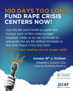 Thursday, October 16th at 10:00am, the Pennsylvania Coalition to Advance Respect (PCAR) and Pittsburgh Action Against Rape (PAAR) will hold a joint press conference to demand immediate action from state lawmakers as Pennsylvania’s budget impasse surpasses 100 days—leaving all 47 rape crisis centers across the Commonwealth without critical funding.